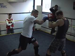 Ma evidentemente il combattimento che preferisce Sauwer è quello alla corta distanza e quindi si iniziano a lavorare tecniche da questa peculiarità tecnica, con montante dx, gancio sx e low kick dx.